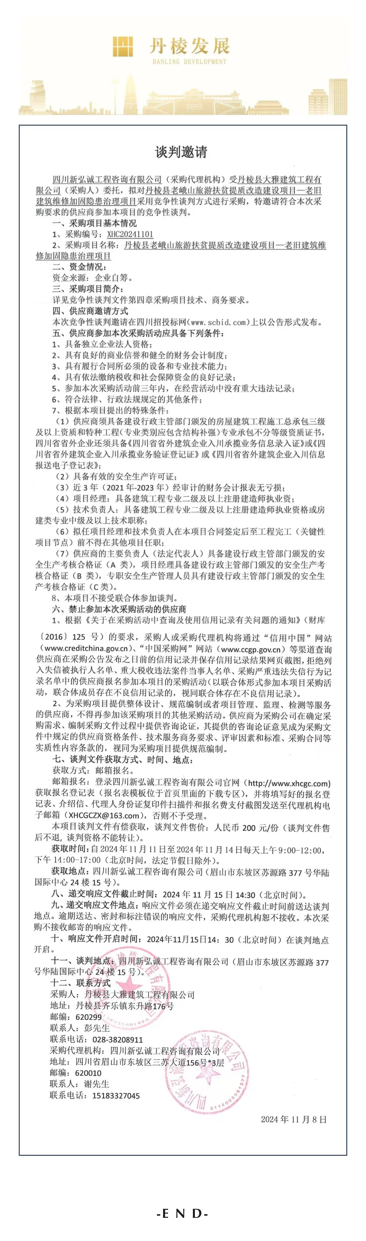 丹棱縣老峨山旅游扶貧提質改造建設項目——老舊建筑維修加固隱患治理項目談判邀請公告