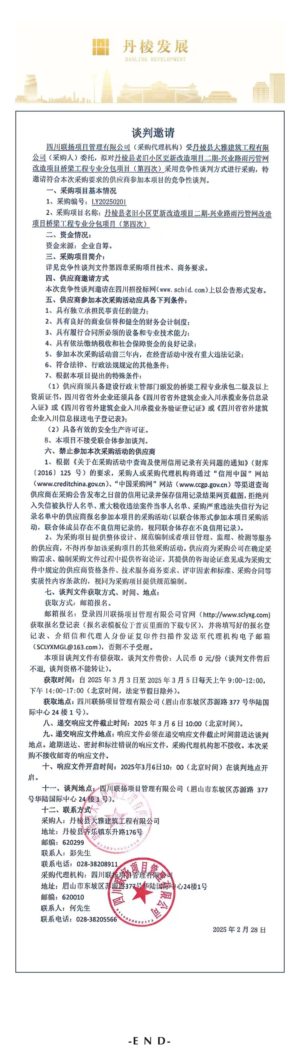 丹棱縣老舊小區更新改造項目二期-興業路雨污管網改造項目橋梁工程專業分包項目談判邀請公告(第四次)