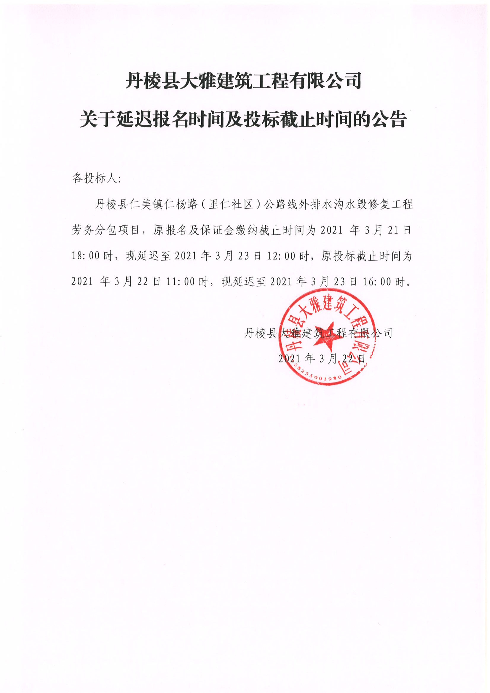 【大雅建筑公司】丹棱縣仁美鎮仁楊路(里仁社區)公路線外排水溝水毀修復工程勞務分包關于延遲報名時間及投標截止時間的公告