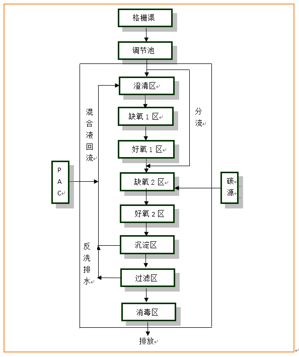 污水首先通過格柵去除漂浮物等較大垃圾,減少污水中頭發絲、絨狀絮體等細小漂浮物進入后端生化處理系統。格柵渠設置在調節池內。通過格柵攔截污水中的纖維狀及較大的顆粒狀雜質。調節用以均衡水量、水質,內置潛污泵及回流措施,以保證一定的額定流量提升至污水處理設備。