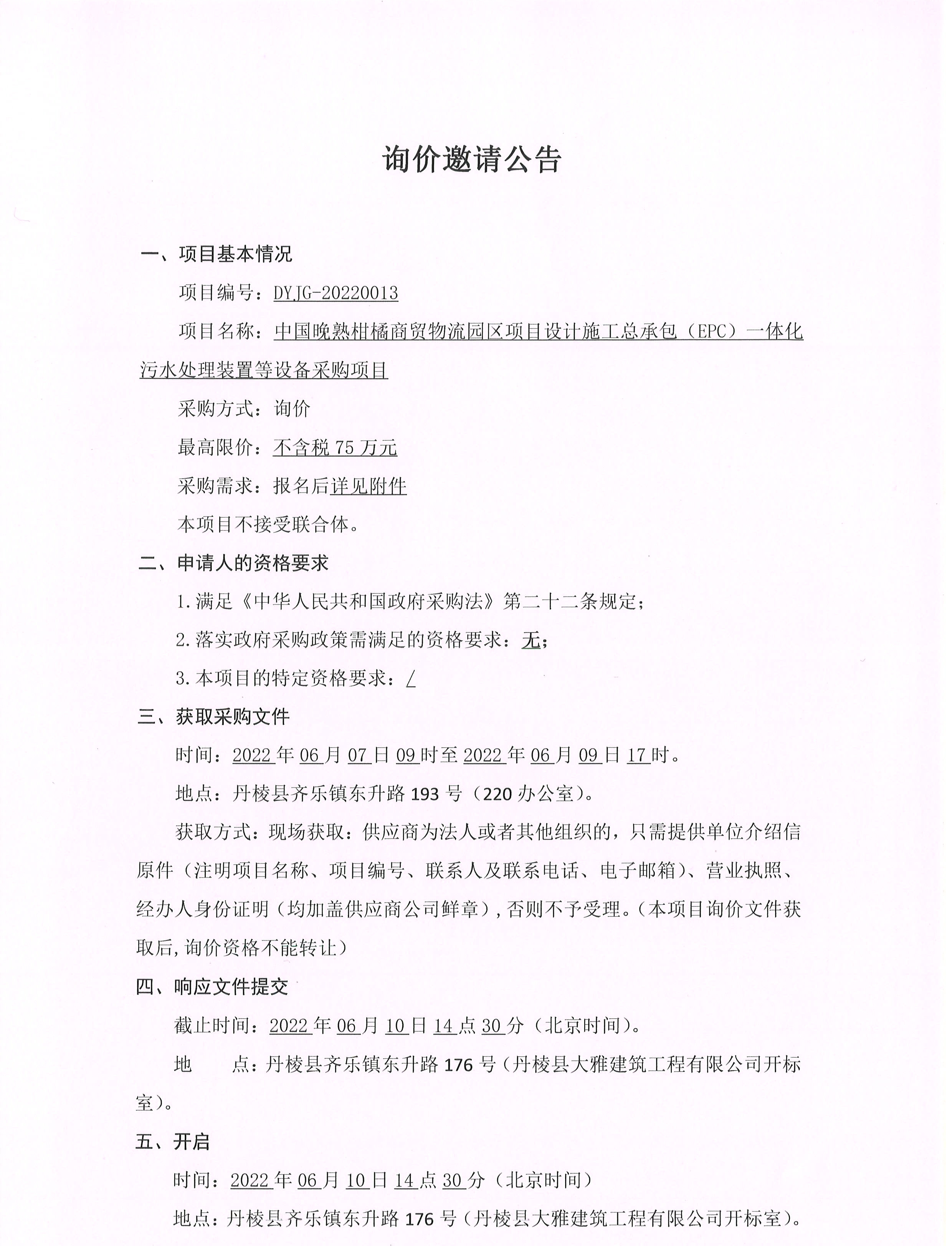 中國晚熟柑橘商貿(mào)物流園區(qū)項目設(shè)計施工總承包(EPC) 體化污水處理裝置等設(shè)備采購項目詢價邀請公告