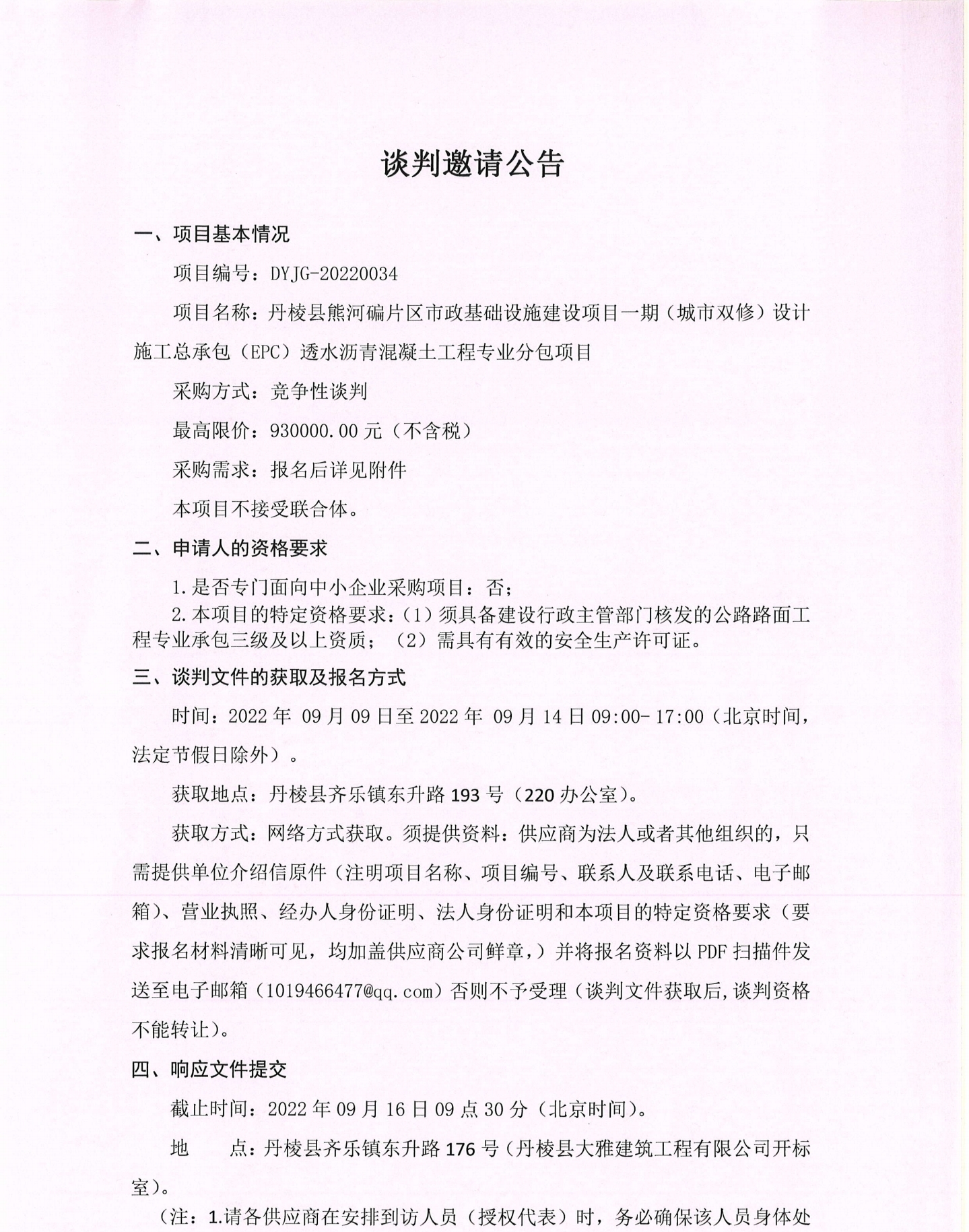 丹棱縣熊河碥片區市政基礎設施建設項目一期(城市雙修)設計施工總承包(EPC)透水瀝青混凝土工程專業分包項目談判邀請公告
