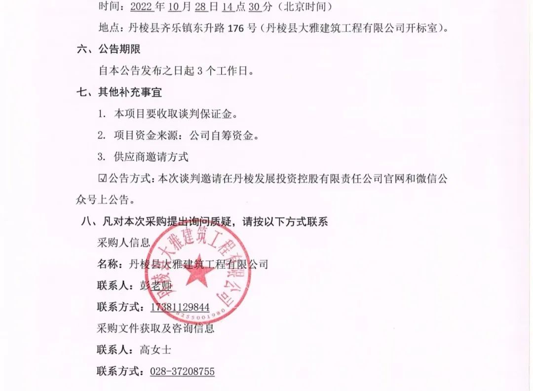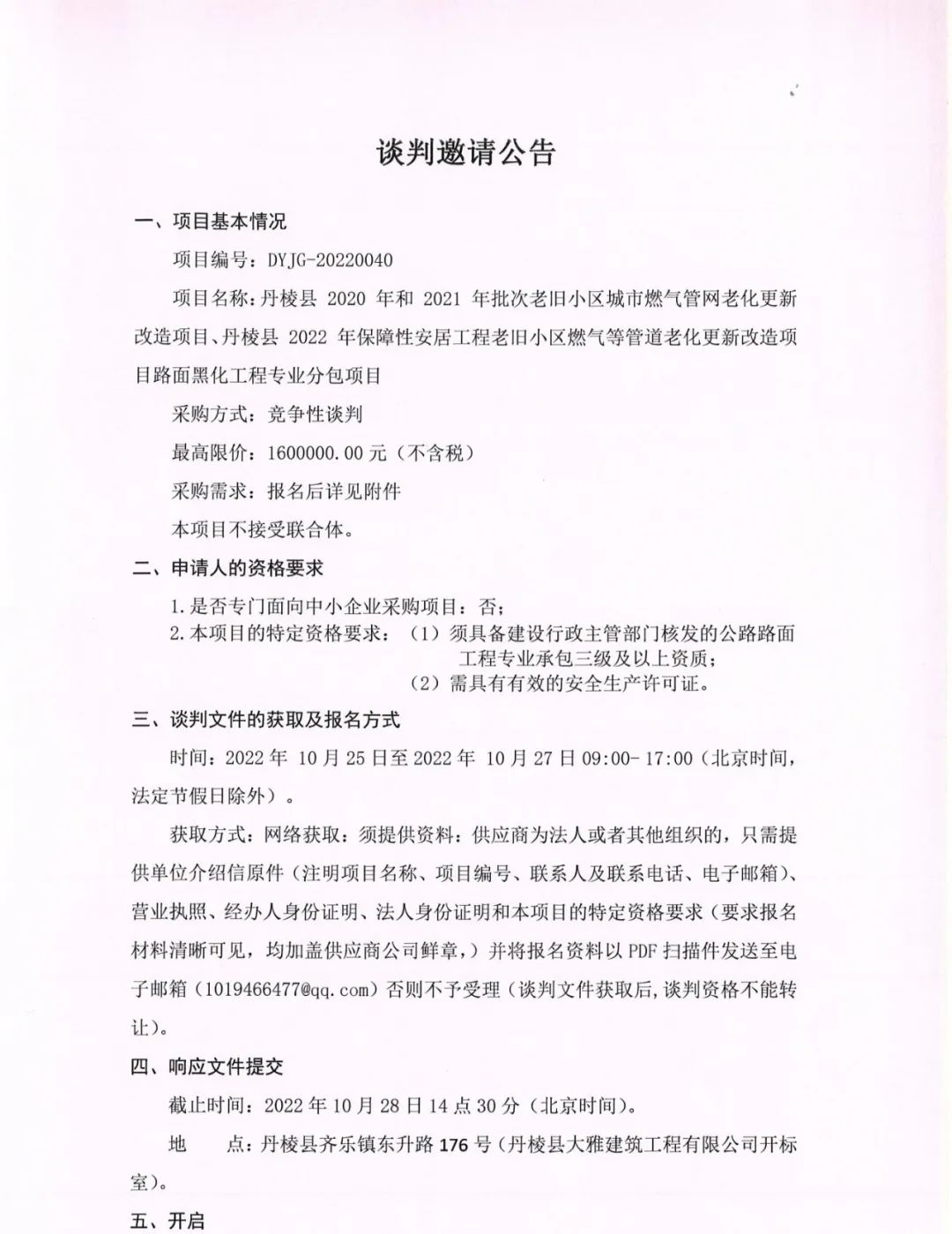 丹棱縣 2020 年、 2021 年、 2022 年保障性安居工程老舊小區燃氣等管道老化更新改造項目路面黑化工程專業分包項目談判邀請公告