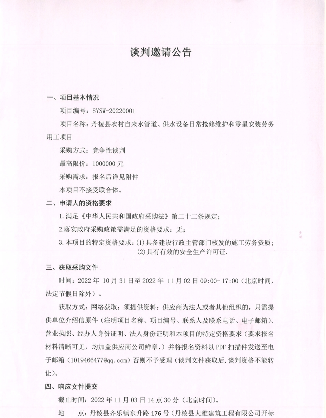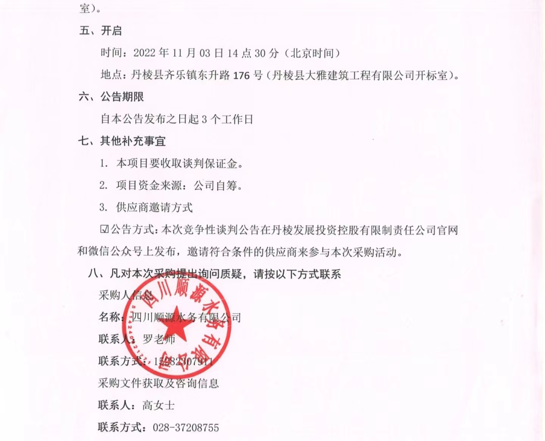 丹棱縣農村自來水管道、供水設備日常搶修維護和零星安裝勞務用工項目談判邀請公告