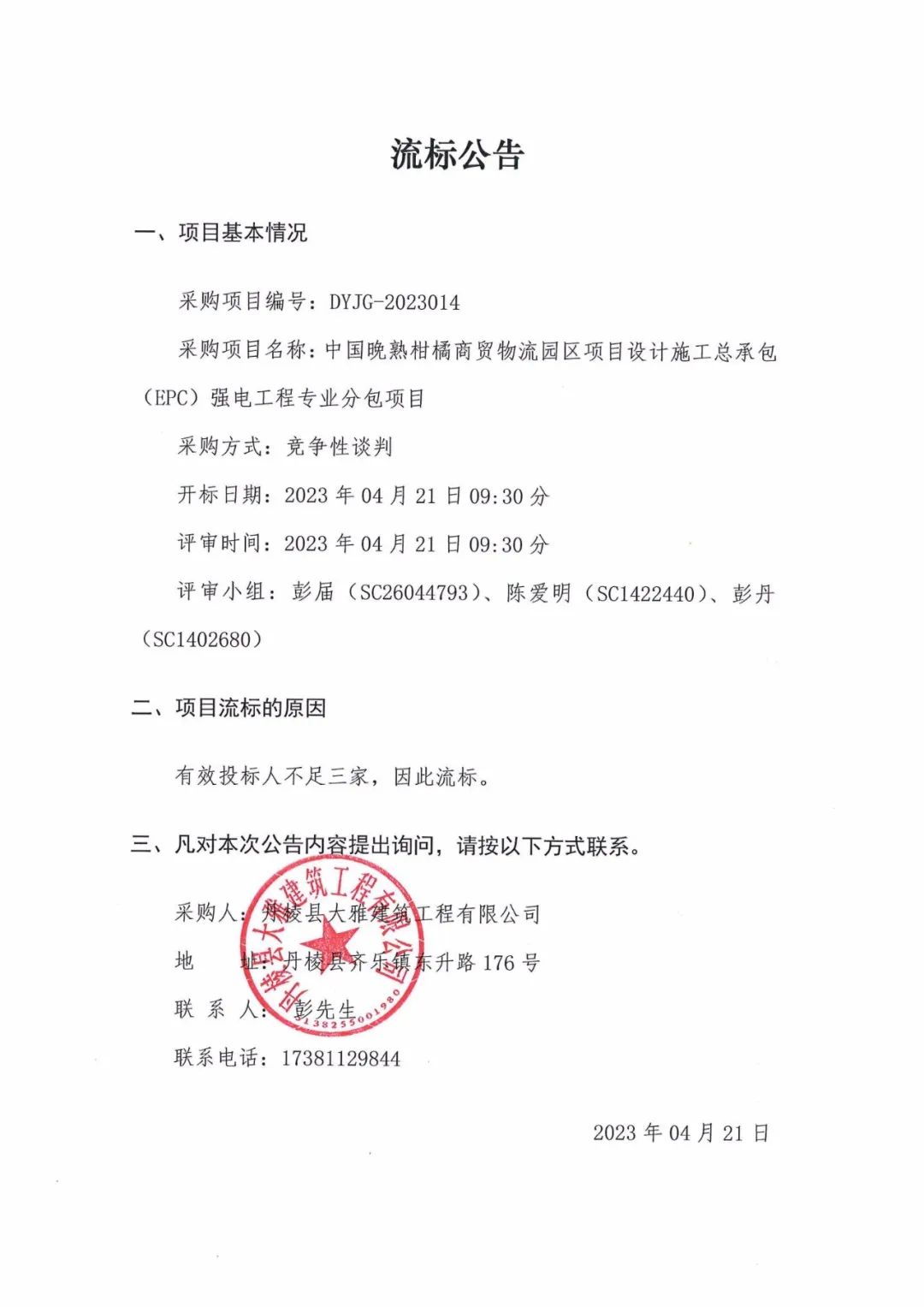 中國晚熟柑橘商貿(mào)物流園區(qū)項目設(shè)計施工總承包(EPC)強(qiáng)電工程專業(yè)分包項目流標(biāo)公告