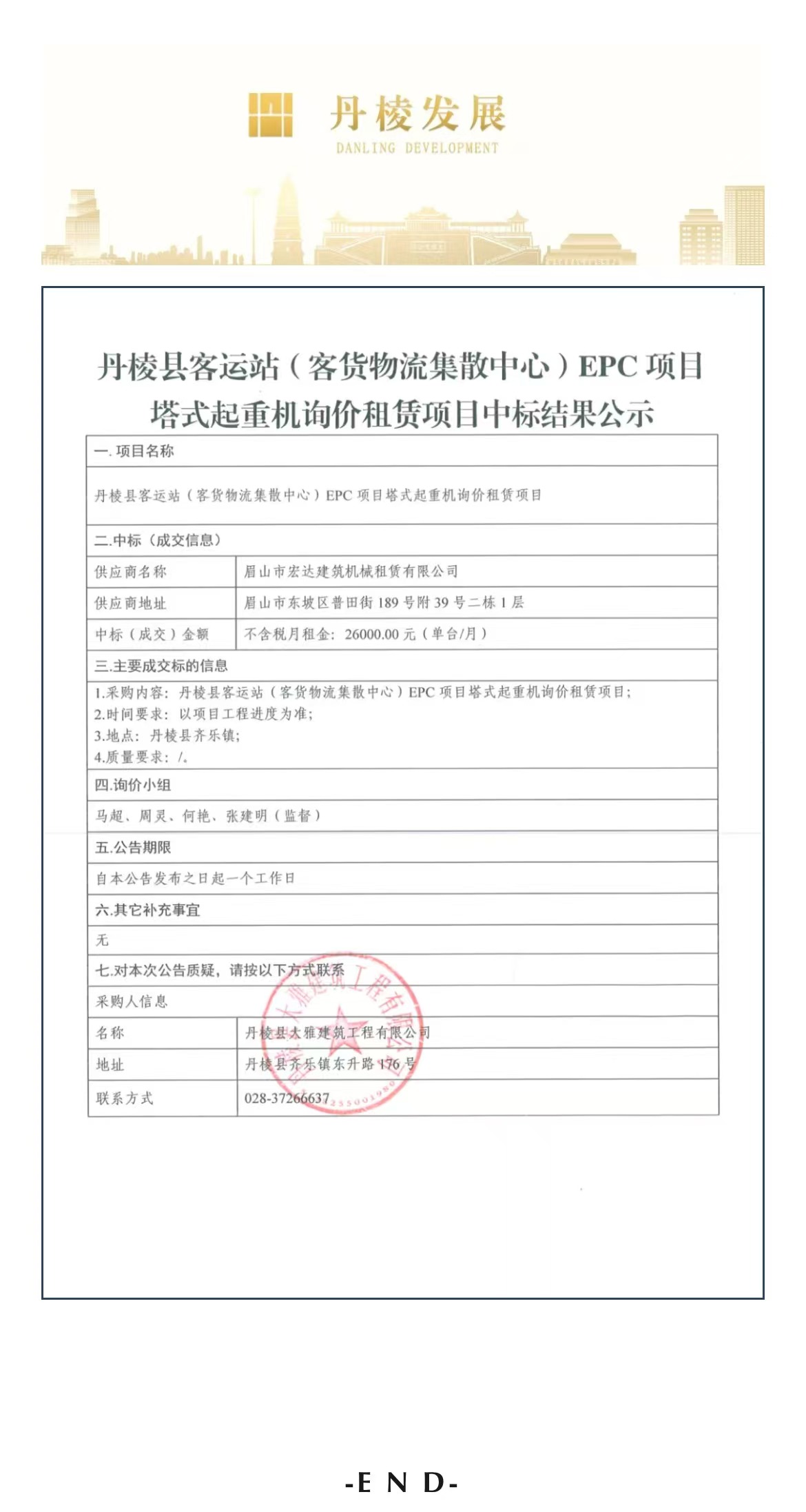 丹棱縣客運(yùn)站(客貨物流集散中心)EPC項(xiàng)目塔式起重機(jī)詢(xún)價(jià)租賃項(xiàng)目中標(biāo)結(jié)果公示
