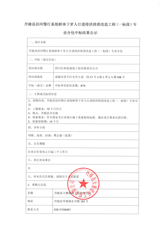 【大雅建筑公司】丹棱縣沿河慢行系統橋體下穿人行道排洪排澇改造工程(一標段)專業分包中標結果公示