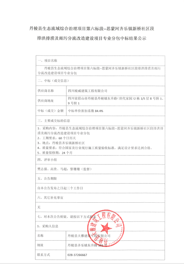 【大雅建筑公司】丹棱縣生態流域綜合治理項目第六標段—思蒙河齊樂鎮新橋社區段排洪排澇及雨污分流改造建設項目專業分包中標結果公示
