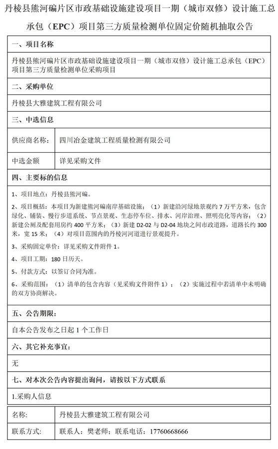 丹棱縣熊河碥片區市政基礎設施建設項目一期(城市雙修)設計施工總承包(EPC)項目第三方質量檢測單位固定價隨機抽取公告
