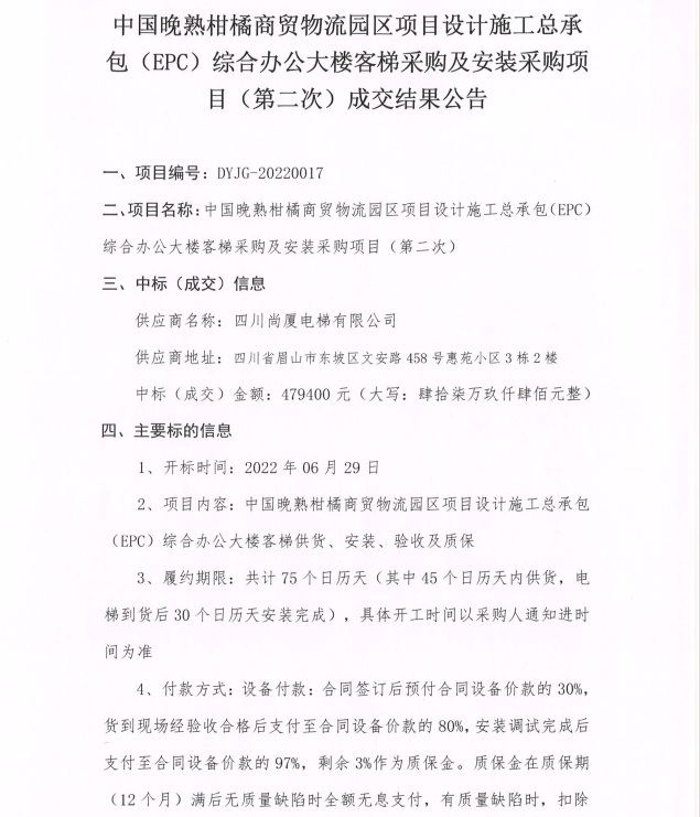 中國晚熟柑橘商貿物流園區項目設計施工總承包(EPC)綜合辦公大樓客梯采購及安裝采購項目(第二次)成交結果公告