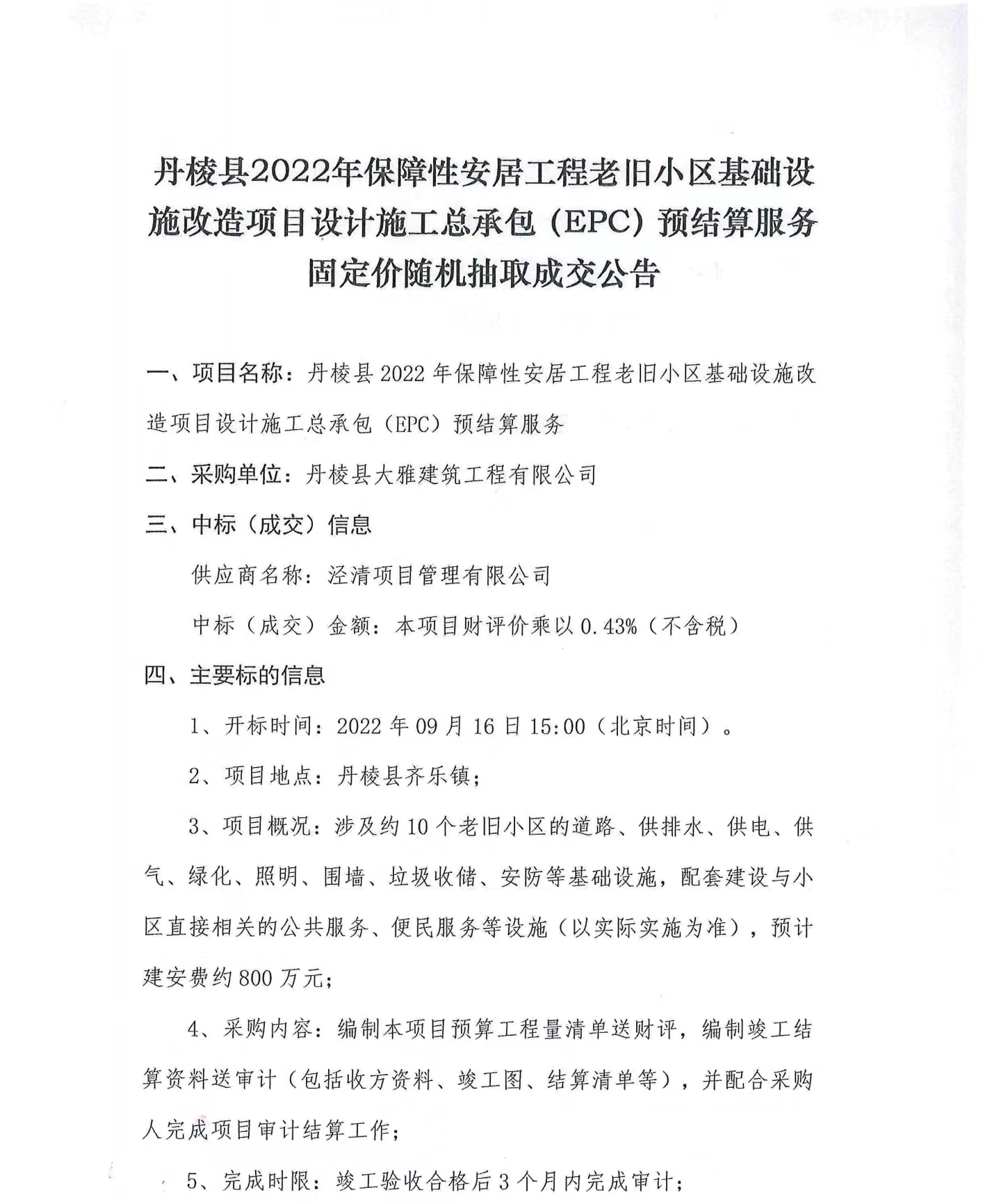 丹棱縣2022年保障性安居工程老舊小區基礎設施改造項目設計施工總承包(EPC)預結算服務固定價隨機抽取成交公告