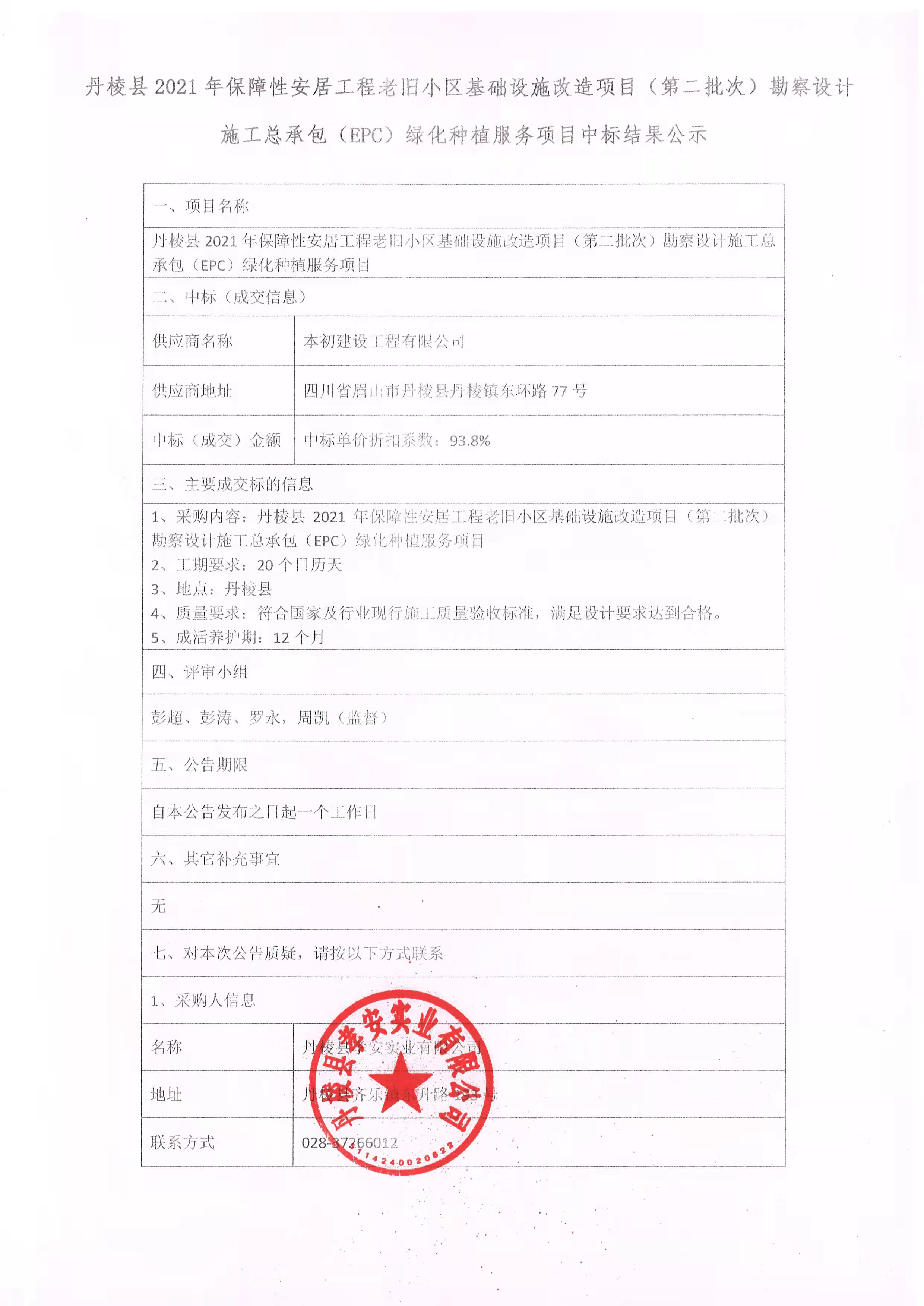【縣孝安公司】丹棱縣2021年保障性安居工程老舊小區(qū)基礎設施改造項目(第二批次)勘察設計施工總承包(EPC)綠化種植服務項目中標結(jié)果公示