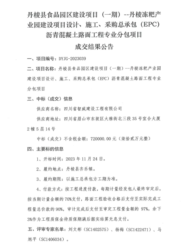 丹棱縣食品園區建設項目(一期)—丹棱凍粑產業園建設項目設計、施工、采購總承包(EPC)瀝青混凝土路面工程專業分包項目成交結果公告