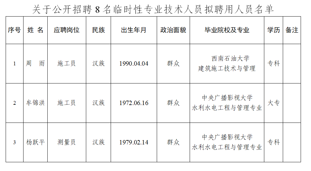根據《丹棱縣大雅建筑工程有限公司關于公開招聘8名臨時性專業技術人員的公告》(以下簡稱《公告》)有關規定,經研究決定,現將擬聘用人員予以公示,公示期限為3個工作日,從公示之日起計算。