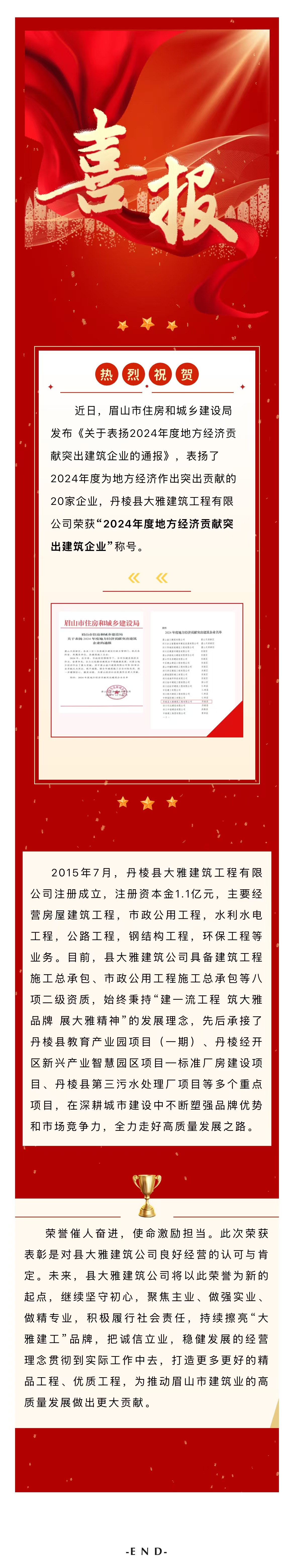 【縣大雅建筑公司】喜報!榮獲全市2024年度地方經濟貢獻突出建筑企業
