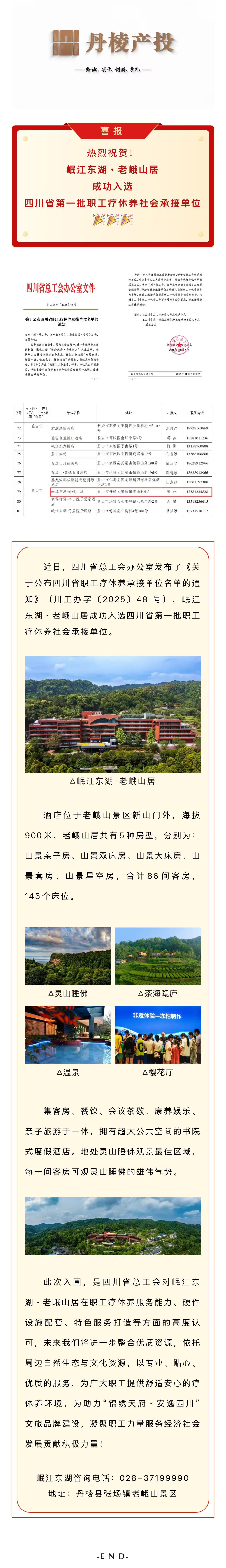 【縣文旅公司】喜報!岷江東湖・老峨山居入選四川省第一批職工療休養社會承接單位名單!