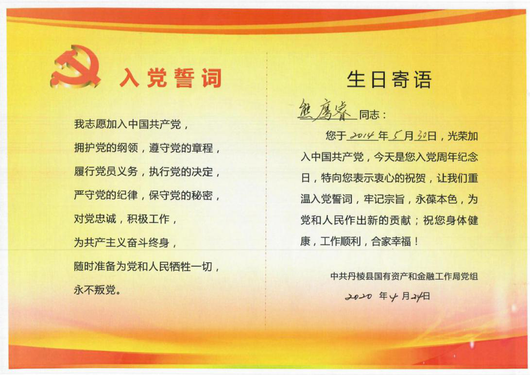 工作安排后,縣國資金融局黨組集體為5月入黨黨員過政治生日,縣國資金融局(縣金融服務中心)副主任茍永慶同志過生日的黨員們送上精心制作的“黨員政治生日卡”,勉勵黨員同志要“常思入黨初衷、銘記入黨誓詞、牢記黨員義務”,發揮黨員先鋒模范作用,在今后的工作中不斷創先爭優,做好表率;顒幼詈螅w黨員同志在縣國資金融局黨組成員、副局長潘國榮同志的帶領下重溫入黨誓詞、面對黨旗莊嚴宣誓。