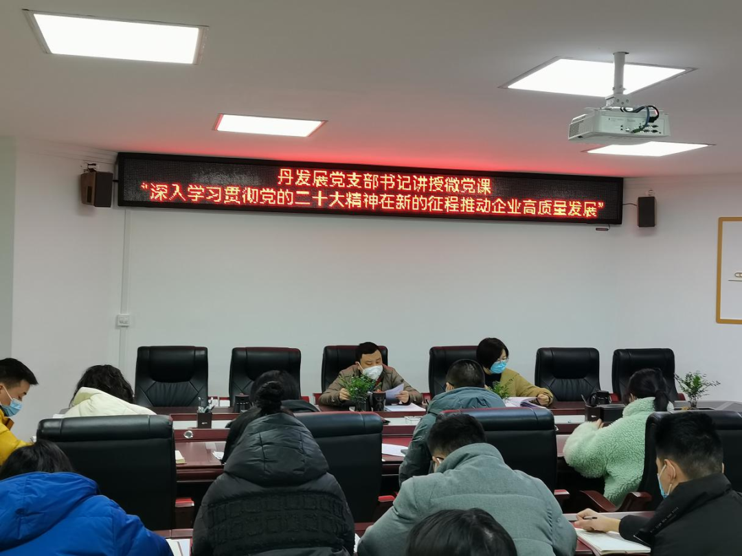按照縣委《關于認真學習宣傳貫徹黨的二十大精神的通知》相關要求,12月16日,丹發展黨支部召開黨員(擴大)會議,由支部書記講黨課,學習貫徹黨的二十大精神。丹發展公司全體黨員及員工參加。